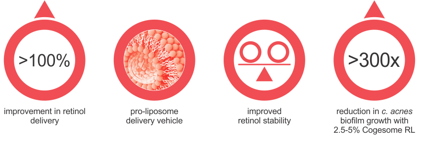 The power of retinol is undisputed, accelerating epidermal renewal and enhancing collagen and hyaluronic acid production. Cogesome® RL rapidly penetrates the skin, delivering retinol for optimal performance. Cogesome® RL quickly shepherds retinol from the skin’s surface into the skin to maximize efficacy. Properly managed retinol is one of skin’s best supporters, contributing to a healthy glow and youthful appearance.