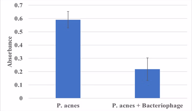 Schematic is shown that indicates the process by which bacteriophage specific to P. acnes will be cultivated, purified, and qualified. Graph of the absorbance at 600 nm of P. acnes cultures before and after incubation with P. acnes targeted bacteriophage. Absorbance drops more than half.
