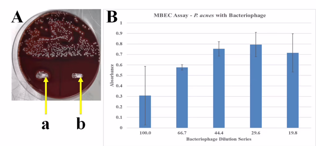 A. Blood agar plate with streaked culture of P. acnes exhibiting characteristic hemolytic pattern. Also, pegs from an MBEC plate from wells inoculated (a) or not (b) with P. acnes to confirm presence or absence of bacterial biofilms. B. Absorbance at 600 nm of residual bacteria shed from wells incubated with bacteriophage at indicated dilutions.